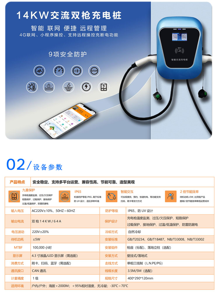 | 名 称 | 双枪充电桩 | 输出电流 | 双枪1 4 K W / 6 4 A |