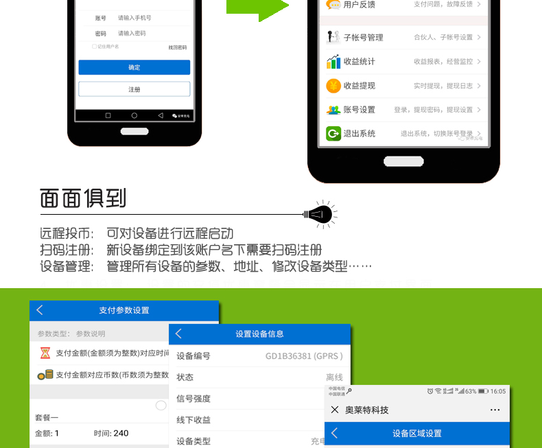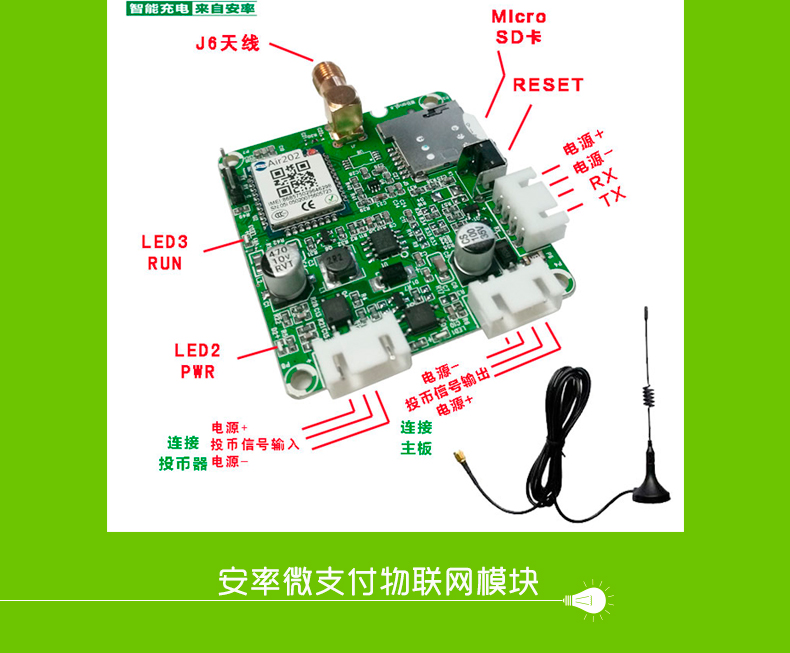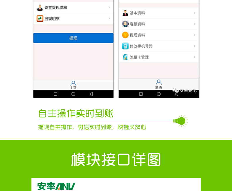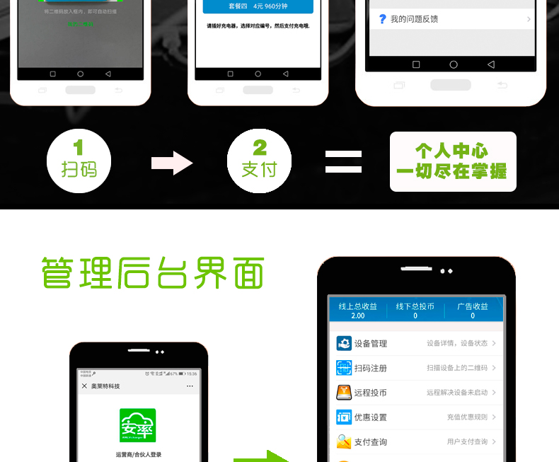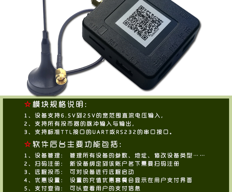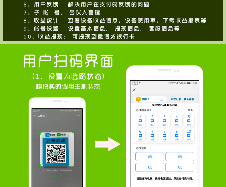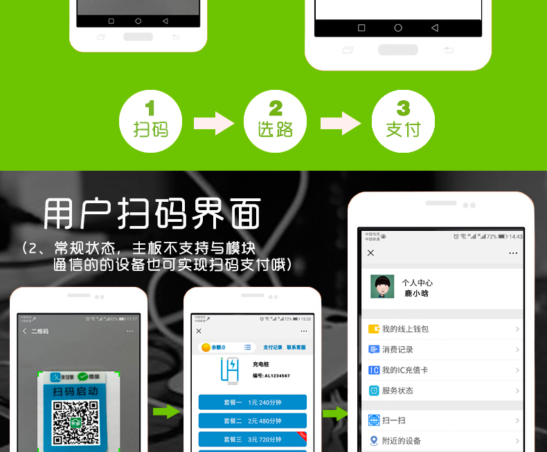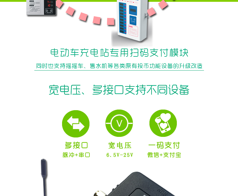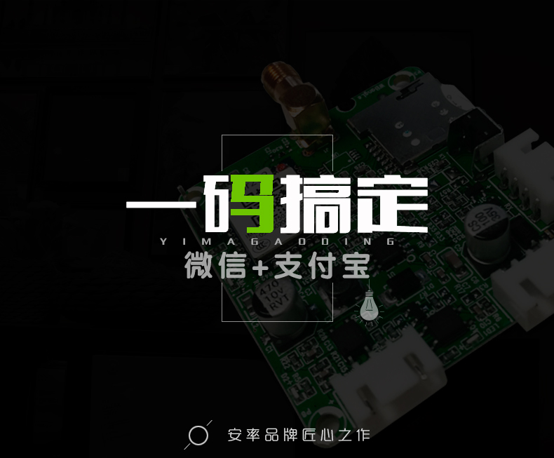 安率®扫码支付模块:微信、支付宝一个二维码搞定,扫码反应速度快,收费价格、套餐、优惠等自由设定,收益随时查询、打印,随时提现,平台免费。适用于充电站、充电桩、售水机、售货机、按摩椅、摇摇车等等设备,原设备带有投币器的升级改造成功率99%。