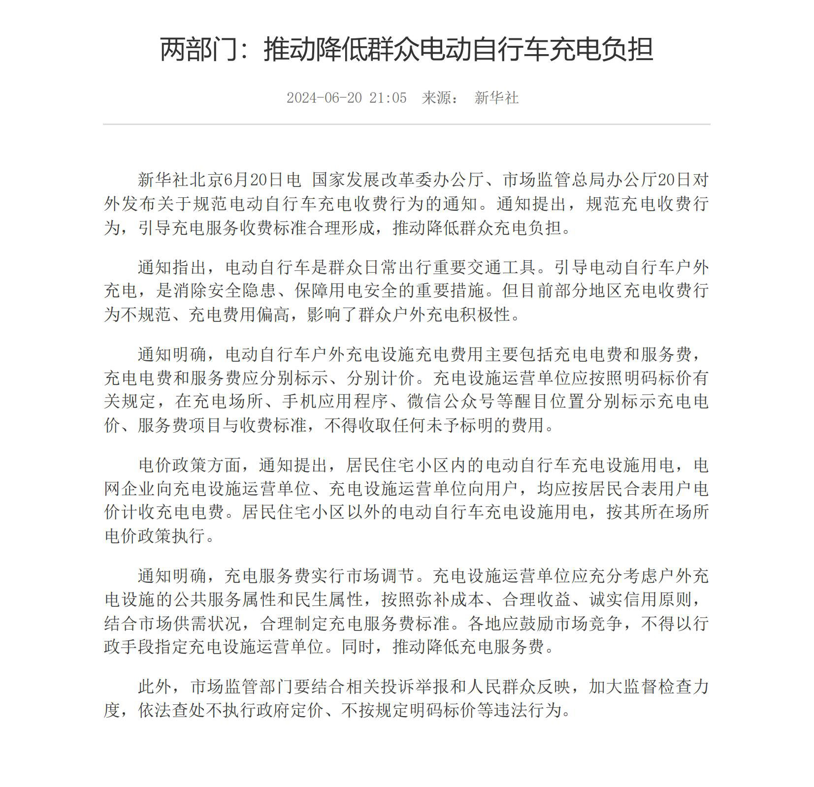新华社北京6月20日电 国家发展改革委办公厅、市场监管总局办公厅20日对外发布关于规范电动自行车充电收费行为的通知。通知提出,规范充电收费行为,引导充电服务收费标准合理形成,推动降低群众充电负担。通知指出,电动自行车是群众日常出行重要交通工具。引导电动自行车户外充电,是消除安全隐患、保障用电安全的重要措施。但目前部分地区充电收费行为不规范、充电费用偏高,影响了群众户外充电积极性。【点击详情】